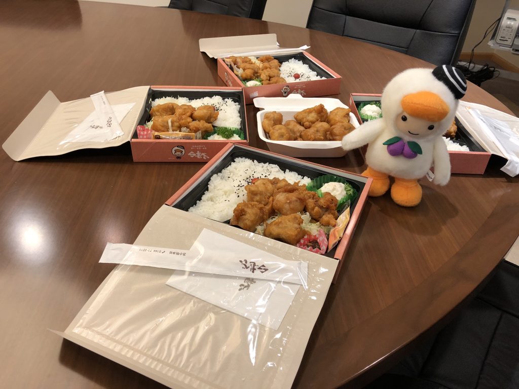 この原稿を書いた本日もから揚げ弁当です(写真右は,苫小牧市公式キャラクターの「とまチョップ」ちゃんです)。
